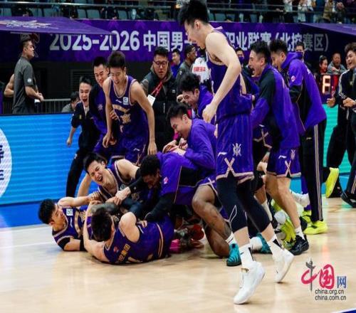 4月1日晚,2025-2026賽季CBA常規賽第33輪,北京控股男籃主場89比88逆轉廣州。圖為北京控股男籃隊員里勒絕殺對手后全隊慶祝勝利。中國網記者 鄭亮攝