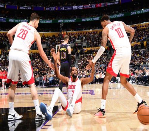 上半場杜蘭特證明了什么是絕對核心,7投6中的效率,撐起了火箭隊的進攻體系。而杜蘭特被稱為歷史最偉大的得分手之一,也是有原因的。要知道上一場比賽杜蘭特還在養傷,這一場也是在比賽開始前1個小時才宣布復出的。下半場,湖人改變防守策略,開始頻繁包夾杜蘭特,給杜蘭特上對抗,不讓杜蘭特持球,讓其往底線傳球。而一旦杜蘭特傳球,湖人的后場和側翼就會伺機完成搶斷。所以杜蘭特在下半場就送出了5次失誤,全場9次失誤也是其職業生涯季后賽新高!上下半場判若兩人,這樣的表現,可以說完全不是杜蘭特的風格。不過,要說火箭隊輸掉G2,全讓杜蘭特背鍋,顯然不公平。