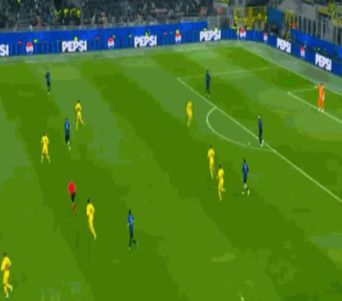 第68分鐘,巴雷拉挑傳,迪馬爾科果斷前插倒三角回敲,阿坎吉不停球低射遠角卻擊中了立柱,錯過了將功補過的機會,國米兩回合下來已經擊中了3次門框。大比分落后,國米的大舉壓上給予了對手更多的反擊機會;第72分鐘,海于格右路長傳反擊,埃夫連前插到禁區停球低射一氣呵成,0:2,總比分已經來到了1:5!
