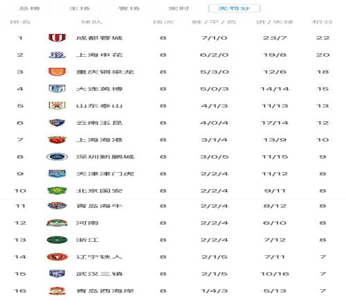 如果沒有罰分,中超8輪過后蓉城領(lǐng)跑,申花第二,泰山第五